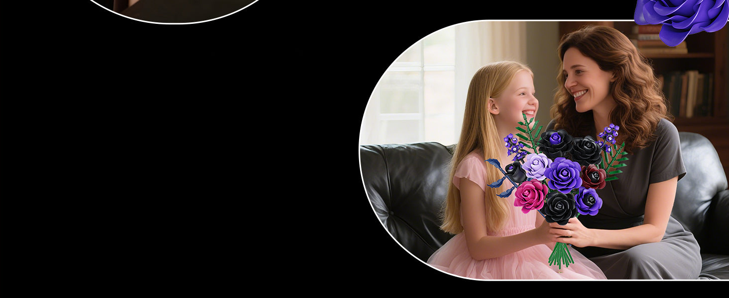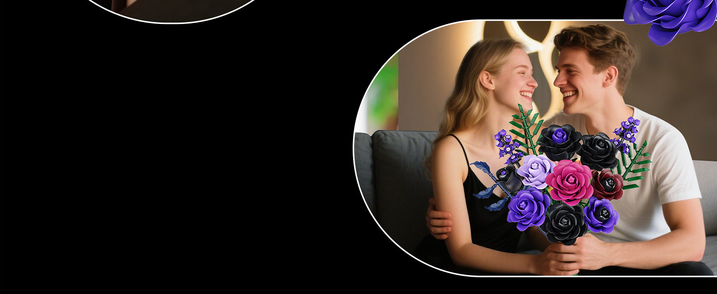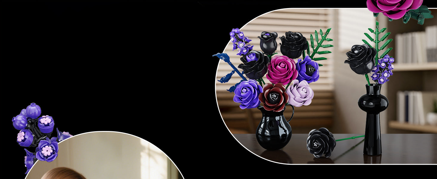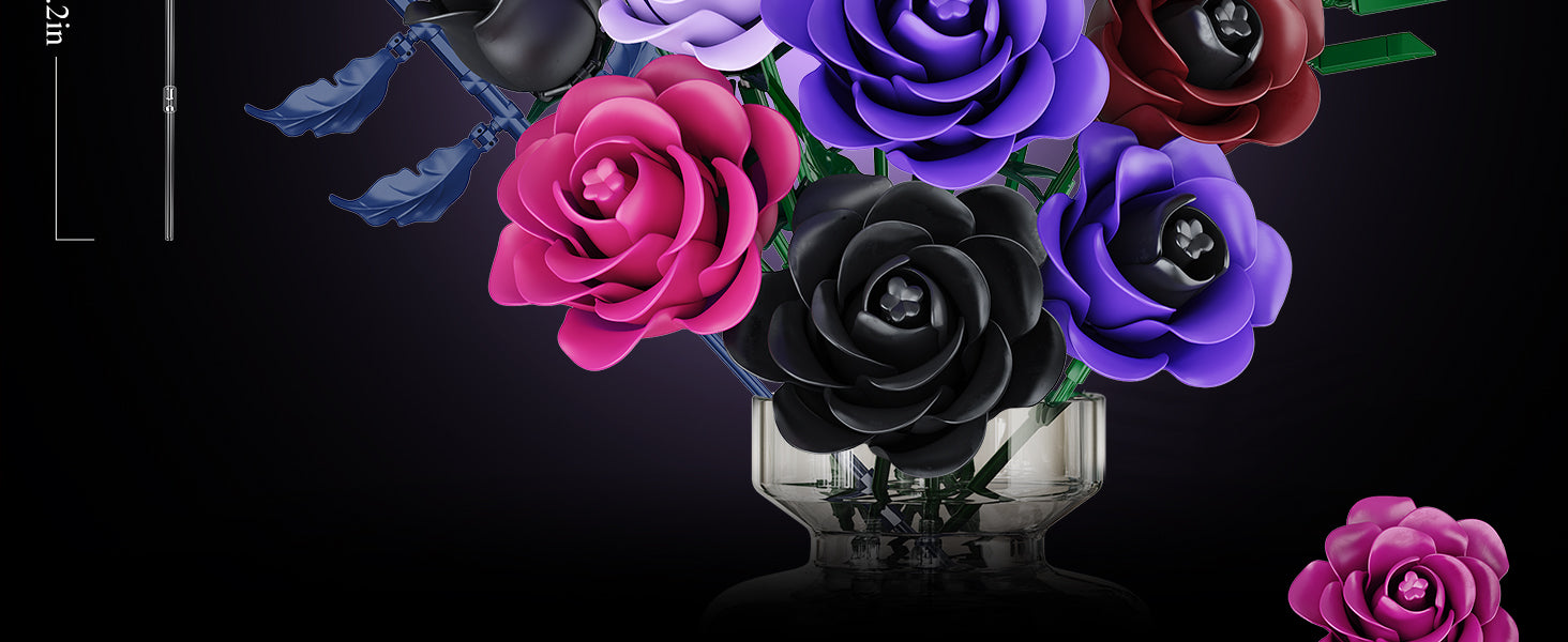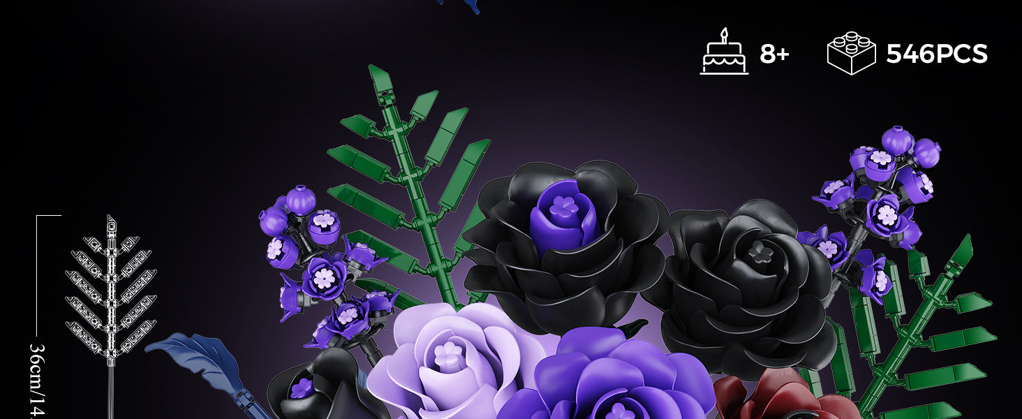 Der künstliche rosen spielzeug besteht aus 14 baubaren Blumen, darunter violette, schwarze, hellviolette und magentafarbene Rosen, Veilchen, Schneeblumen und Palmenblätter.