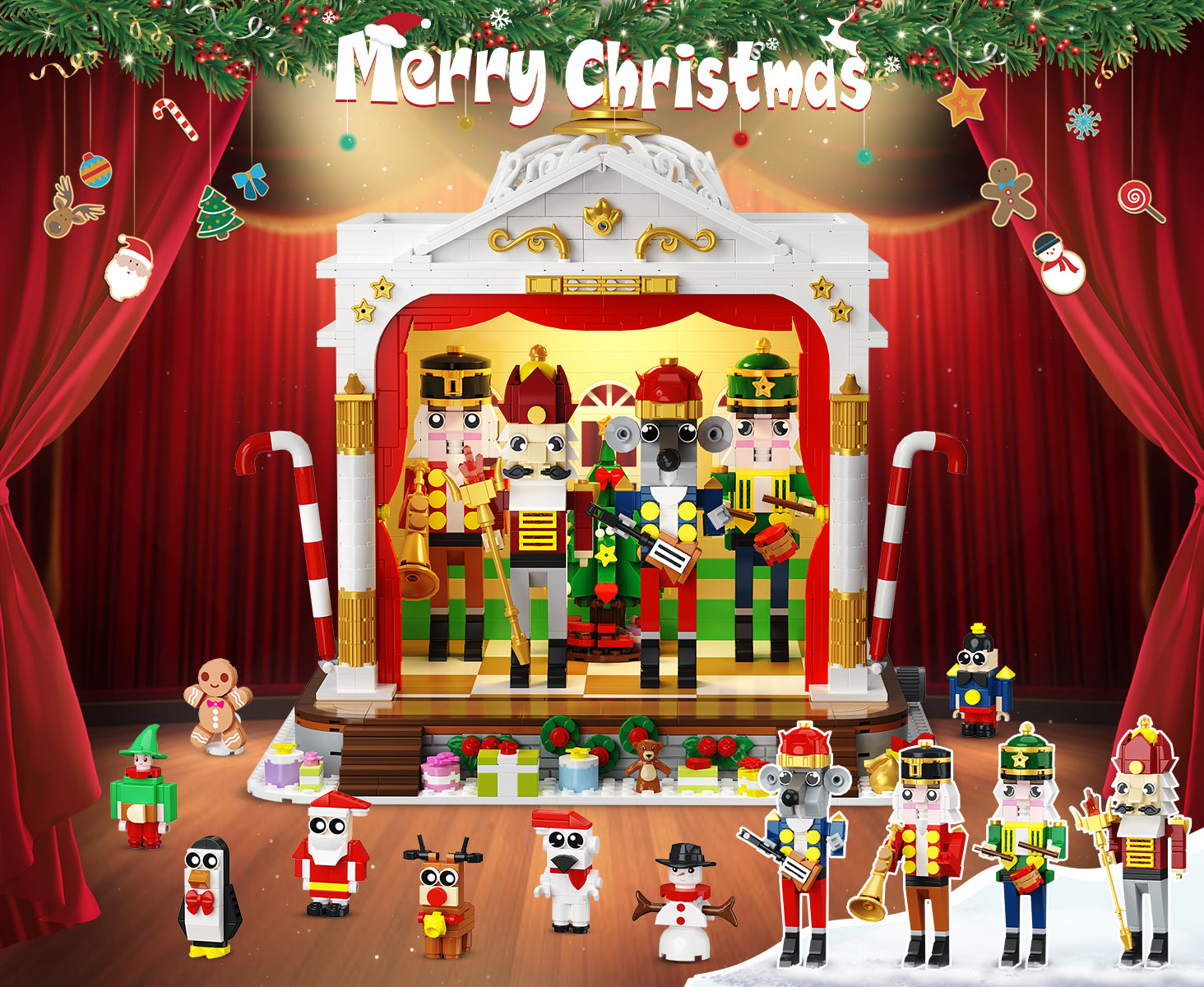 Dieses festliche Bauset präsentiert eine kunstvoll gestaltete Bühne mit 4 klassischen Spielzeugsoldaten und 8 charmanten Minifiguren.