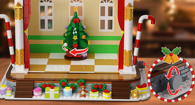 Im Mittelpunkt der Szene steht ein drehbarer Weihnachtsbaum, der sich durch Drehen eines Knopfes sanft bewegen lässt.
