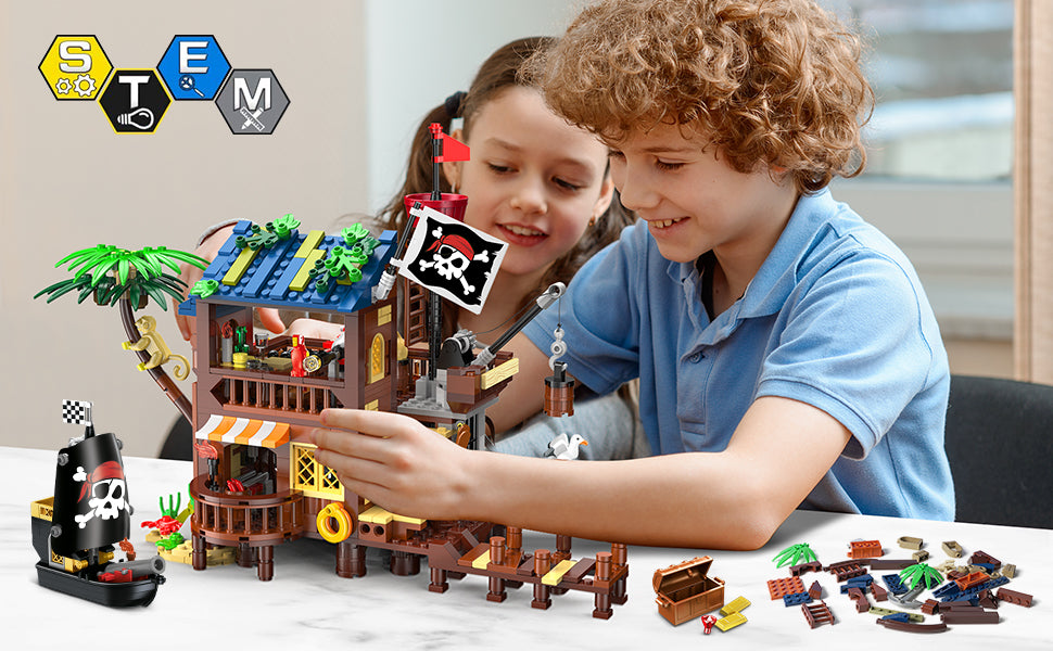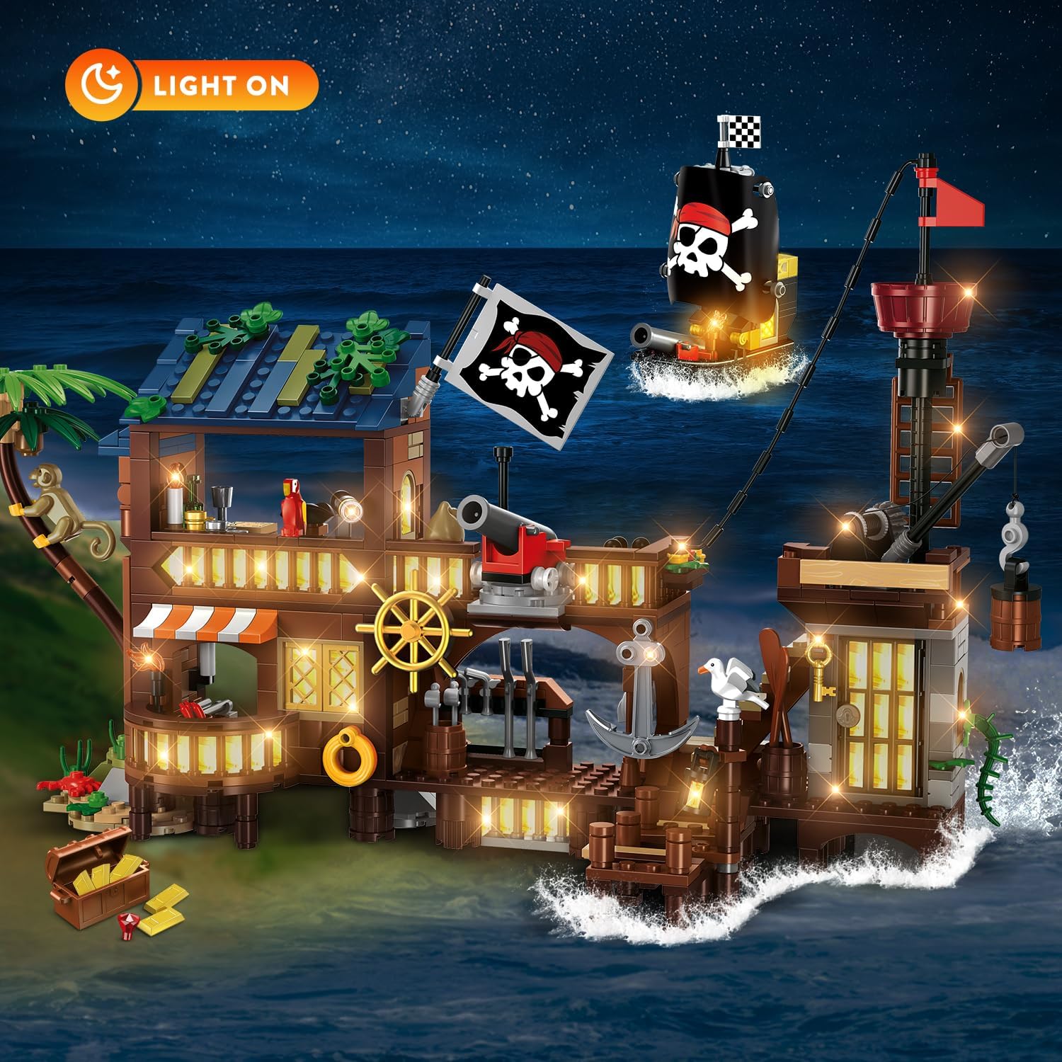 HOGOKIDS Neuestes Piratenschiff-Hafen-Bauset mit LED-Beleuchtung für Kinder, Mädchen, Jungen im Alter von 6 bis 12+ Jahren und Erwachsene