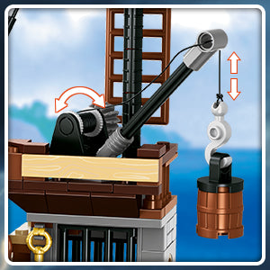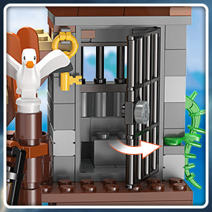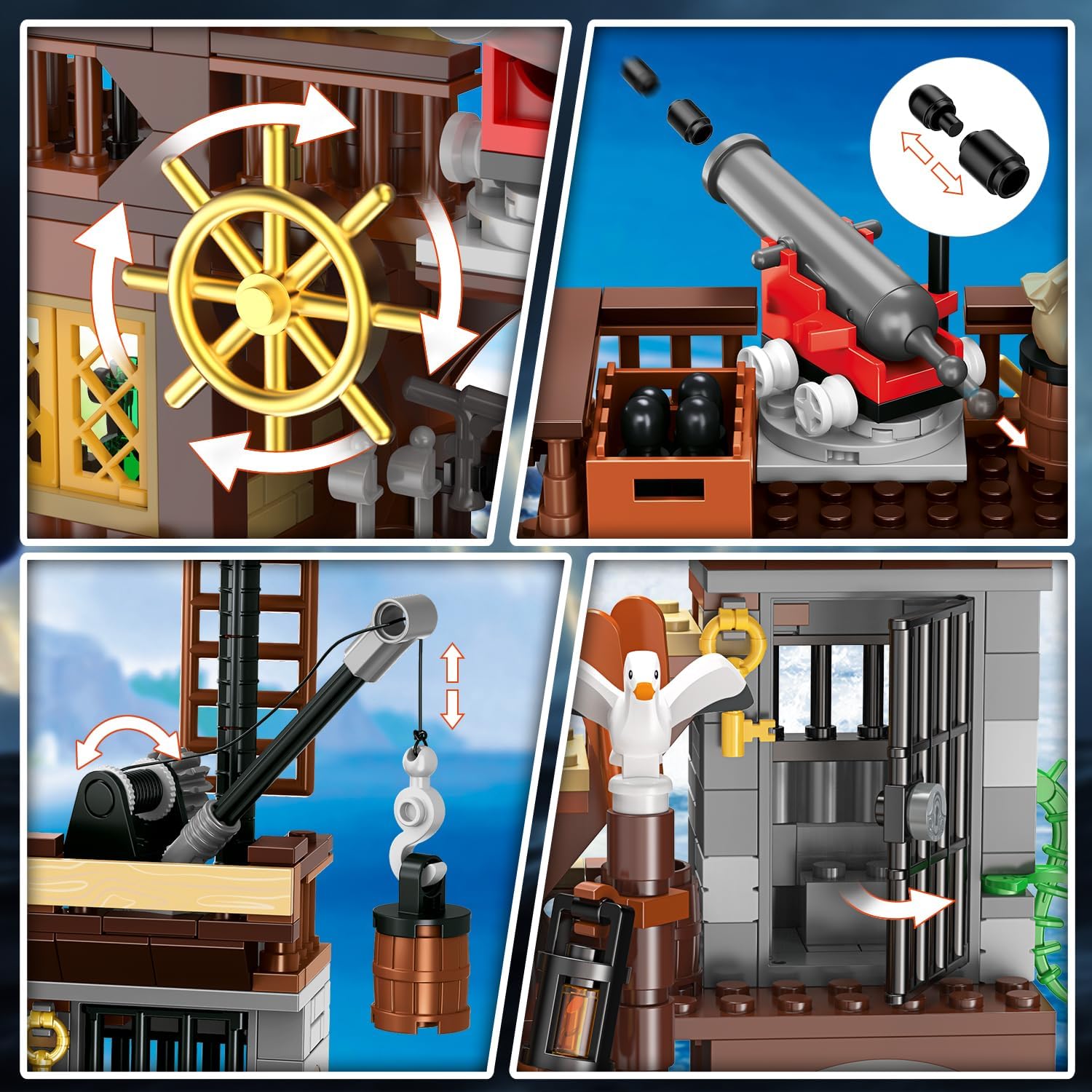 Entdecke die Kapitänskajüte, die Taverne, das Versorgungsdock, das Waffenlager, die Gefängniszelle und den versteckten Schatz sowie jede Menge lustiges Zubehör, verschiedene Tiere und zwei Kanonen, die zu actionreichen Geschichten inspirieren.