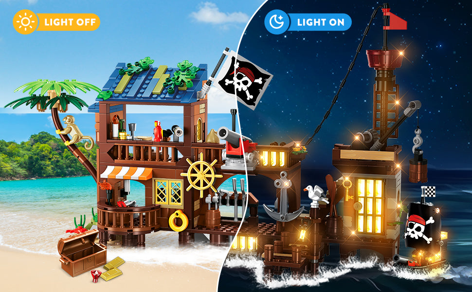 Dieses Gebäude im Piratenstil ermöglicht mit seinem kreativen Lichtdesign einen erstaunlichen Lichteffekt und eine warme Atmosphäre einer Taverne am Meer bei Nacht. Kinder, die das Piratenleben lieben, haben beim Bau des Piratenschiffs unendliche Spielmöglichkeiten.