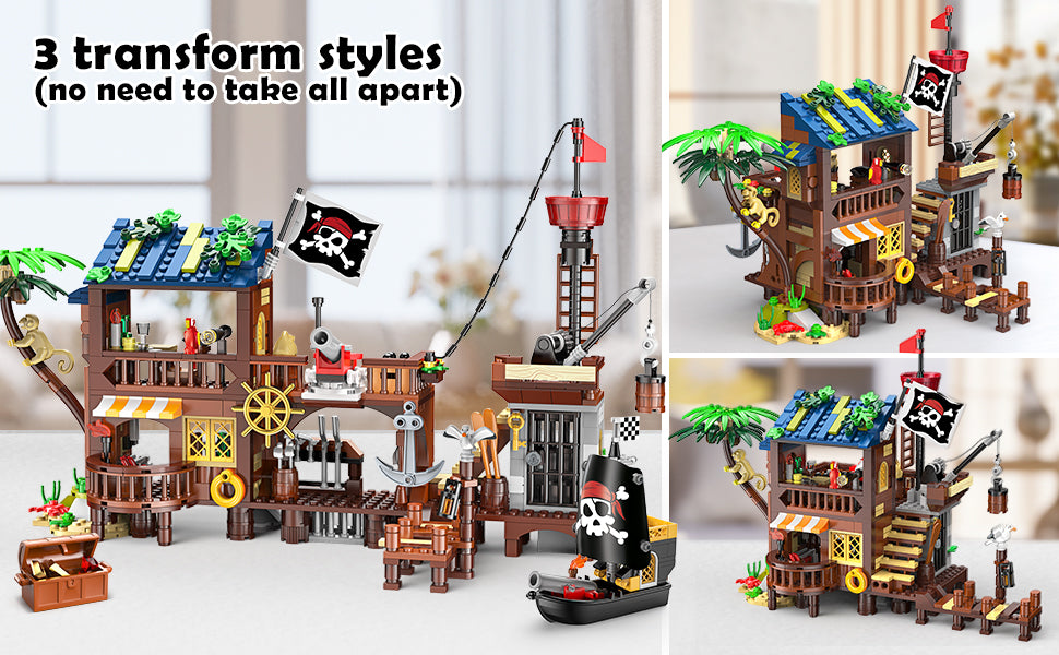 Dieses Bauspielzeugset zum Thema Piraten gibt es in 3 verwandelbaAren Ausführungen (es muss nicht komplett auseinandergebaut werden). Dieses Thema ist voller satter Farben und Geschichten und eröffnet eine ganz neue Welt des Spielens und der Kreativität.