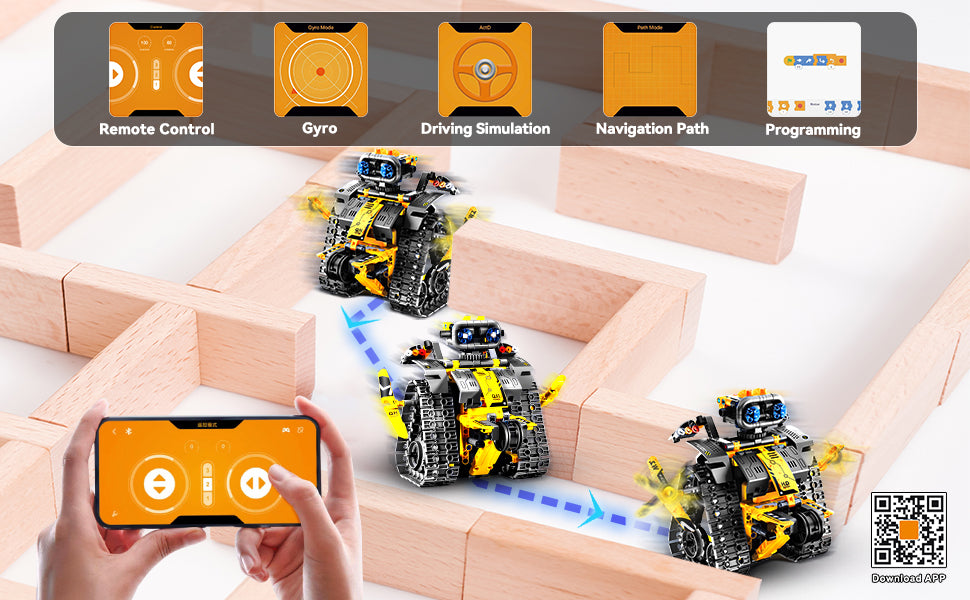 Doppelte Fernbedienung: Ausgestattet mit einem hochwertigen Motor kann der technik ferngesteuertes roboter per 2,4-GHz-Fernbedienung und App gesteuert werden, einschließlich Gyroskop-Fahrsimulation, Fernsteuerungs-Navigationspfad und Programmiermodus.